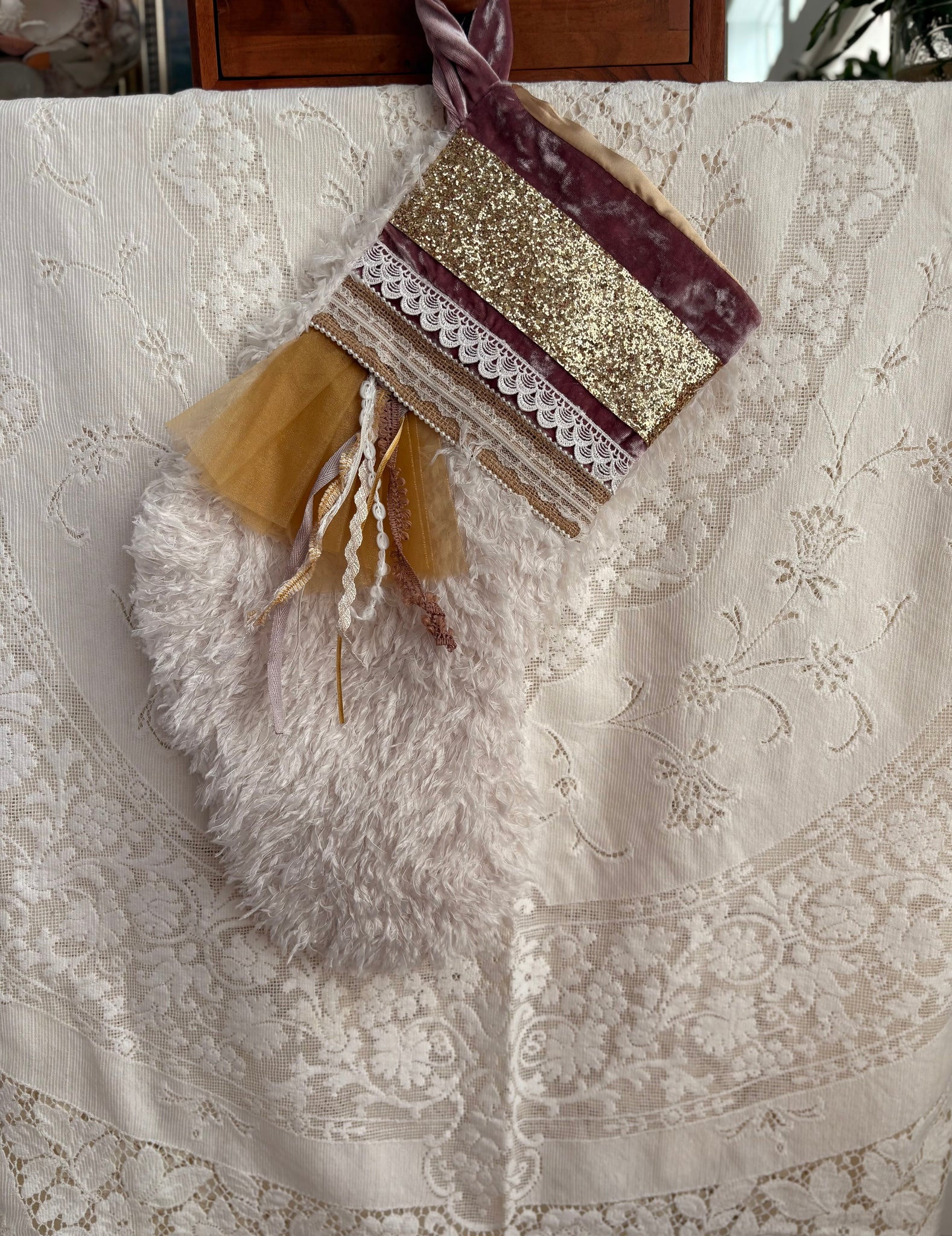 One of a kind (OOAK), enchanted Christmas stocking handcrafted from cotton fabrics, linens, tulle, ribbons, lace, and embellishments including sequins and sparkles. Design your own, one of a kind faux-fur stocking with your choice of embellishments designed to last through generations of magical memories - a perfect heirloom piece. All stockings use faux fur or minky fabric and are lined with champagne colored satin material.